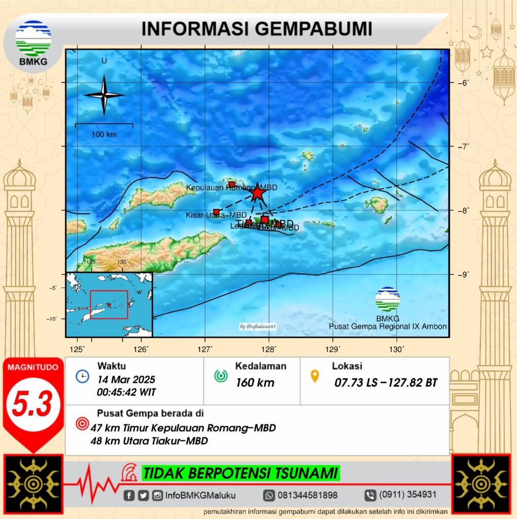 AMBON,Nunusaku.id,- Wilayah Laut Banda-Maluku diguncang gempa tektonik, Kamis 13 Maret 2025 pukul 22.45.42 WIB atau pukul 00.45 WIT, Jumat 14 Maret 2025. Hasil analisis BMKG menunjukkan gempa ini memiliki parameter update dengan magnitudo M5,0 (= 5,3 SR). Episenter gempabumi terletak pada koordinat 7,79° LS ; 127,88° BT, atau tepatnya berlokasi di laut pada jarak 41 […]