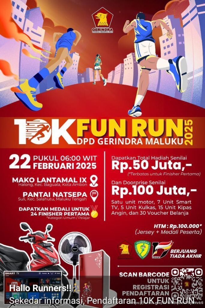 AMBON,Nunusaku.id,- Dalam rangka memperingati hari ulang tahun (HUT) ke-17 Partai Gerindra pada 6 Februari 2025 yang mengusung tema “17 Tahun Berjuang Tiada Akhir”, DPD Gerindra Provinsi Maluku bekerjasama dengan Persatuan Atletik Seluruh Indonesia (PASI) Maluku mengadakan lomba lari atau fun run 10K. Ketua panitia pelaksana kegiatan, Johan Lewerissa menyebut, Fun Run 10K DPD Gerindra Maluku […]