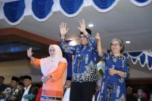 Terlihat, Penjabat Walikota Ambon Dominggus N. Kaya dan Pj Ketua Tim Penggerak PKK Ibu Dessy Kaya begitu sumringah melambaikan tangan sembari melempar senyum khasnya dari tribun utama ke Kafilah MTQ Kota Ambon.